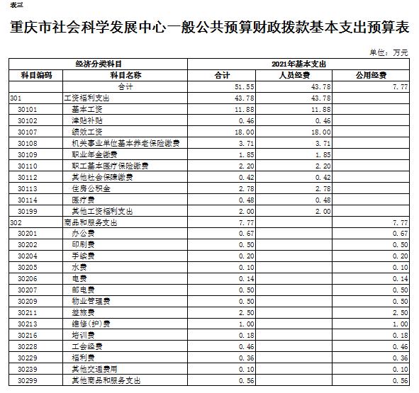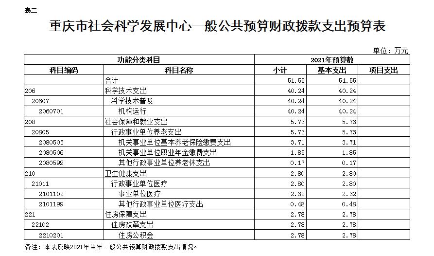 2021年一般公共預算財政撥款收入51.55萬元,一般公共預算財政撥款支出51.55萬元,比2020年增加51.55萬元。其中:基本支出51.55萬元,比2020年增加51.55萬元,主要原因是2021年以前未納入預算,無財政撥款收入,主要用于保障在職人員工資福利及社會保險繳費,保障單位正常運轉的各項商品服務支出等;市社科發展中心2021年無項目支出預算。